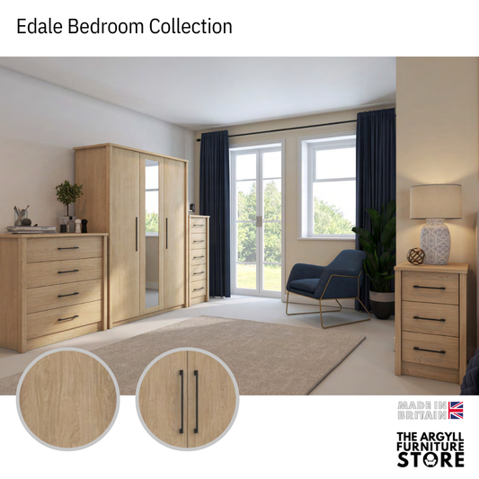Bring warmth, texture, and timeless style to your bedroom with the Edale collection. Crafted with a tactile natural oak finish, this beautifully designed range combines modern simplicity with thoughtful details. Each piece features elegant square pillar edging, robust metal runners for smooth drawer movement, and linen-look drawer and wardrobe interiors for a refined touch. Natural oak finish with tactile grain detail