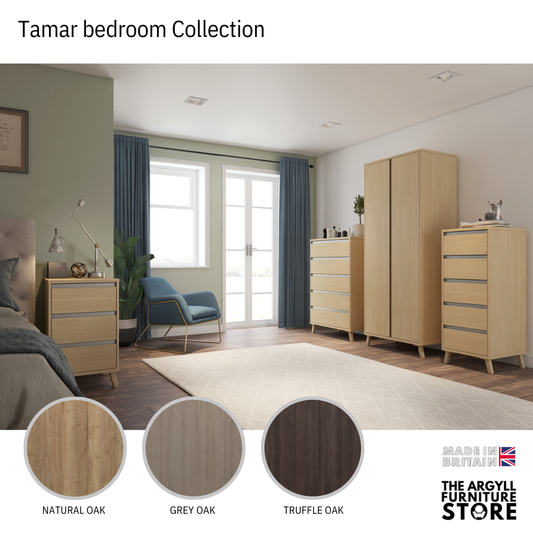 The Tamar Collection blends modern simplicity with natural charm, creating a stylish and functional bedroom space. With a choice of white, grey, or oak-effect finishes, each piece features subtle wood grain textures and a clean, contemporary design that suits a wide range of interiors.