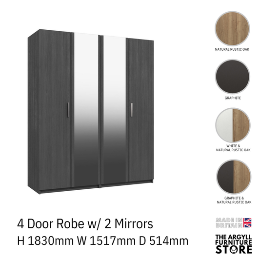 Waterfall 4 door wardrobe with 2 mirrors